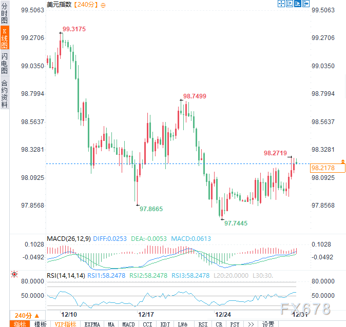 美元或将进入一个“上有顶、下有底”的纠结行情,交易逻辑或许将频繁在“衰退担忧”与“通胀恐惧”之间切换,直至一方数据取得决定性胜利。周三(12月31日)亚市时段,美元指数于98.20附近窄幅震荡。