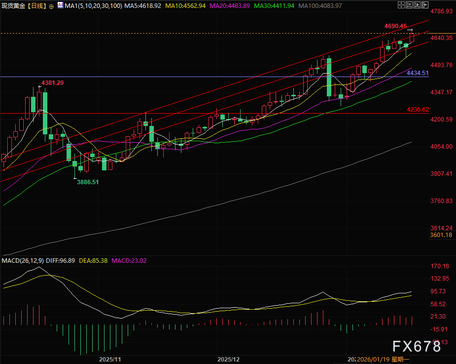 当前黄金正依托4600美元关口构筑关键支撑,4720美元的历史峰值则成为下一轮上行的核心阻力位,也是通道上轨。
