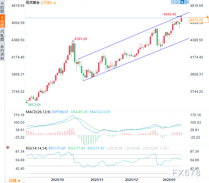 周一(1月19日)亚欧时段,现货黄金震荡上行,日内涨幅约1.6%,现交投于4670美元/盎司附近,此前一度飙升至每盎司4690.46美元,刷新历史峰值,这主要受全球避险资金流向推动。