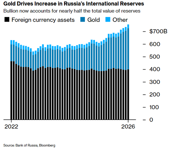 俄罗斯央行的数据显示,从2022年2月到2025年12月,该国黄金储备的价值增加了一倍多,而以外国资产和货币形式持有的储备则下降了约14%。黄金占总储备的比例达到43%,而战前这一比例仅为21%。