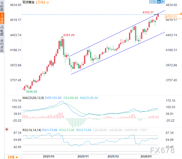 周二(1月20日)亚市时段,现货黄金震荡上涨,日内涨幅约0.6%,现交投于每盎司4700美元附近,截至13:40,现货黄金刷新历史高点达4705.36美元/盎司。由于错综复杂的基本面支撑,避险买盘仍不断涌入黄金。