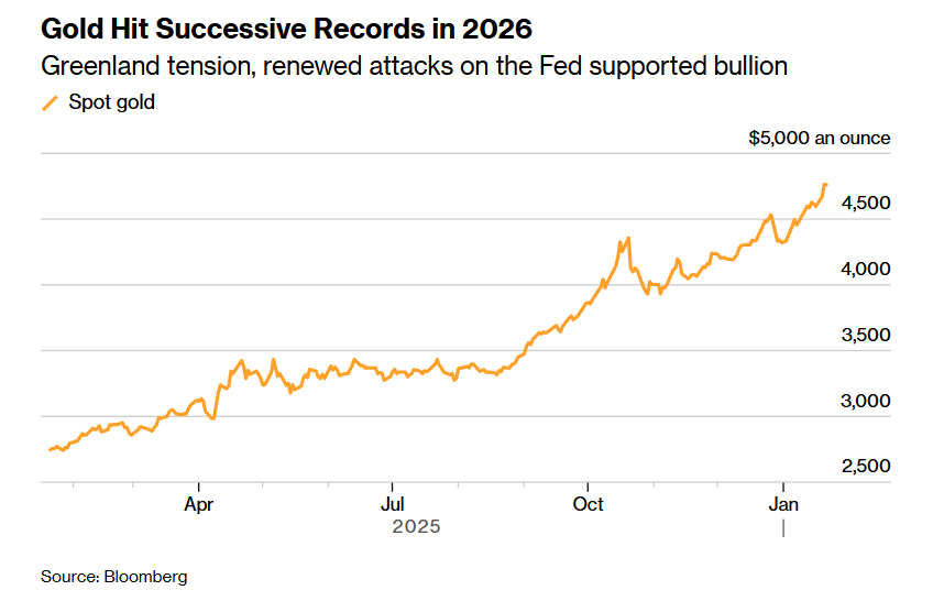 随着围绕格陵兰的主权危机恶化+日债崩盘,黄金在2026年初延续强劲涨势