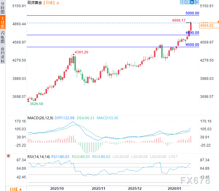 当前世界正处于地缘政治、金融稳定与政治格局的多重风暴眼中,共同推升黄金的避险与价值存储需求。周三(1月21日)亚欧时段,现货黄金震荡上涨,现交投于每盎司4885美元附近,日内涨幅约2.55%,截至14:28,金价一度触及4888.17美元/盎司的历史新高。