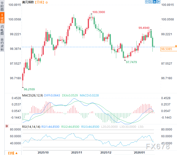 周三美元指数于98.60附近窄幅震荡,此前两个交易日美元指数显著下跌,跌幅约1%。