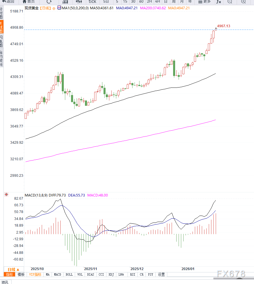 周五亚洲交易时段,国际金价延续强势表现,XAU/USD一度上探至4950美元附近,刷新历史高位区域。